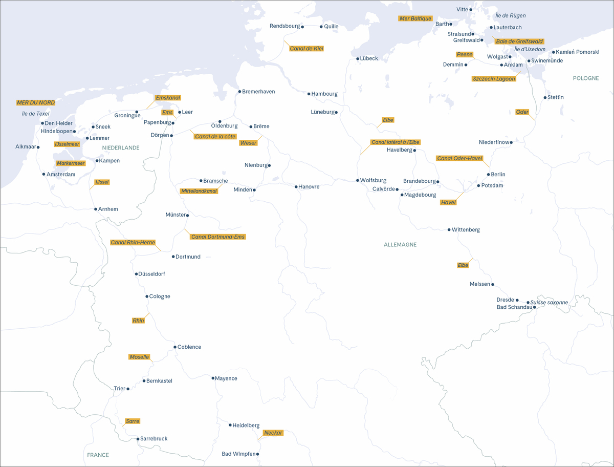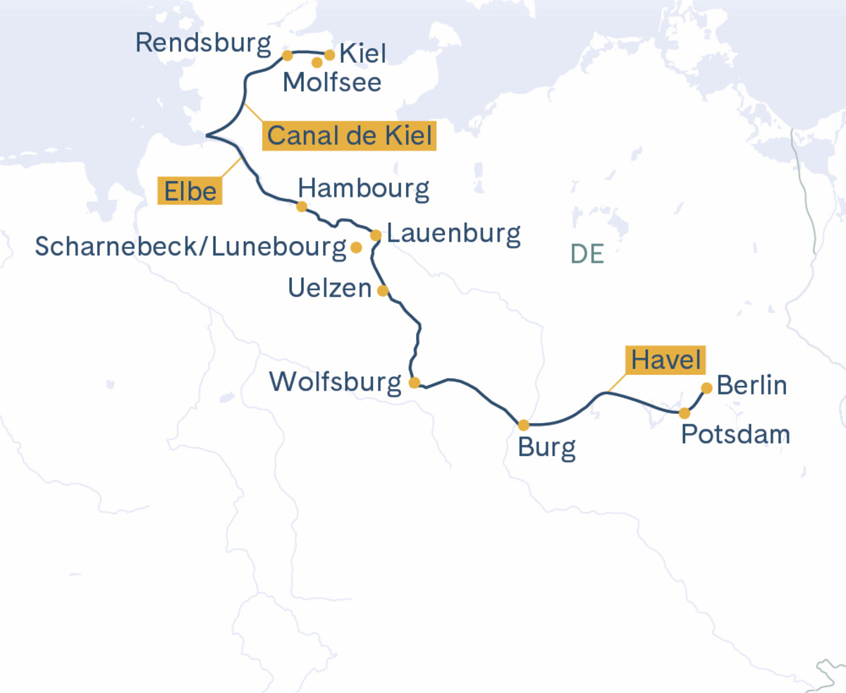 Navigation sur le canal Elbe-Havel à travers la région des lacs du Havelland. Excursion à Potsdam(1) avec passage devant le château de Cecilienhof, le pont de Glienicke et visite du parc de Sanssouci.